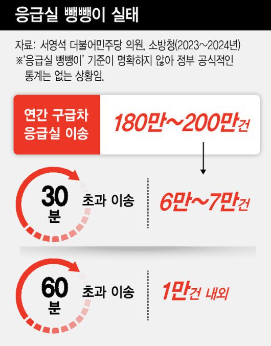 ‘응급실 뺑뺑이’가 얼마나 일어나고 있는지는 명확하지 않다. 기준이 분명하지 않아 통계가 없다. 수용 병원을 찾기까지 걸린 시간이나 전화 횟수 등으로 추정하고 있다. 서영석 더불어민주당 의원과 소방청 자료(2023~2024년)를 보면, 1년에 구급차를 이용한 이송은 평균 180만~200만건 정도다. 이 가운데 30분을 초과하는 이송은 6만~7만건이고, 60분을 넘는 경우는 1만건 내외, 전화를 20통 이상 돌린 사례는 약 1200건이다.