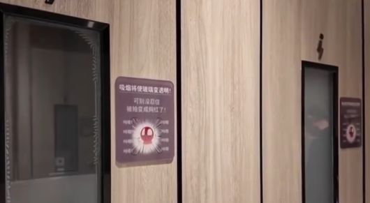 중국 광둥성 선전시의 한 쇼핑센터 화장실 용변 칸에 불투명 유리창이 설치돼 있다. 담배 연기를 감지하면 투명하게 변한다. /사진=대만TVBS 캡처, 조선비즈 |