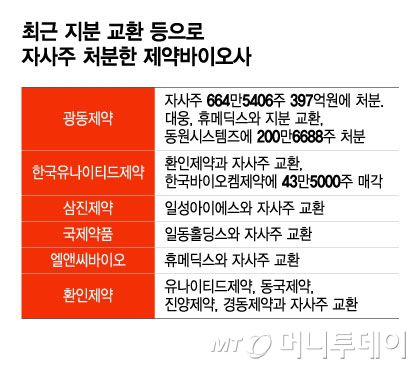 최근 지분 교환 등으로 자사주 처분한 제약바이오사/그래픽=윤선정 |