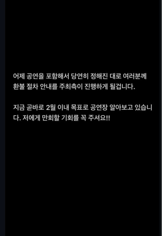 공연 취소와 함께 환불 절차를 안내한 윤종신은 “2월 이내를 목표로 다시 공연장을 알아보고 있다”며 재개 의지도 분명히 했다. 또 공연은 취소됐지만, 같은 시간 공연장을 찾아온 관객들을 위해 라디오 공개방송 및 청음회 형식의 만남을 준비하겠다고 덧붙였다.