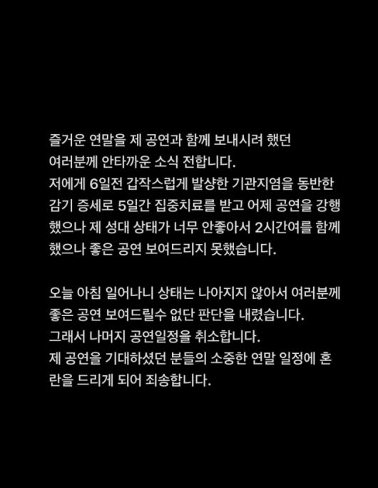 앞서 하루 전인 25일, 윤종신은 연말 콘서트 취소 소식을 직접 알렸다. 그는 “6일 전 갑작스럽게 기관지염을 동반한 감기 증세가 발생해 5일간 집중 치료를 받았다”며 “성대 상태가 좋지 않은 상황에서 공연을 강행했지만, 만족스러운 무대를 보여드릴 수 없었다”고 밝혔다.