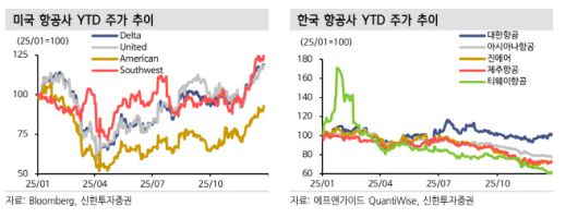 최민기 신한투자증권 연구원은 “미국 항공주가 최근 강세를 보인 반면 국내 항공주는 연중 약세가 지속됐다”며 “환율 안정화와 별개로 원화 약세 흐름 반전은 단기 항공주 투자 센티먼트를 개선시킬 수 있는 요소”라고 밝혔다.