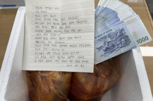 자신을 '세 아이의 아빠'라고 소개한 남성은 신분을 밝히지 않은 채 직접 담근 김장김치와 모두 천원짜리로 이뤄진 현금 3만5000원 그리고 손편지 한 통을 남기고 사라졌다.