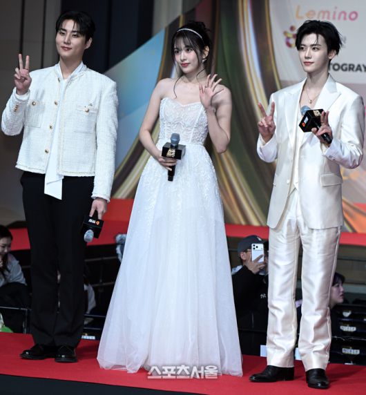 [스포츠서울 글·사진 | 인천 = 이주상 기자] 25일 인천시 영종도 인스파이어 엔터테인먼트 리조트에서 ‘2025 SBS 가요대전’이 열렸다. 사회를 맡은 데이식스 영케이, 아이브 안유진, NCT DREAM 재민(왼쪽부터)이 레드카펫을 소화하고 있다. rainbow@sportsseoul.com