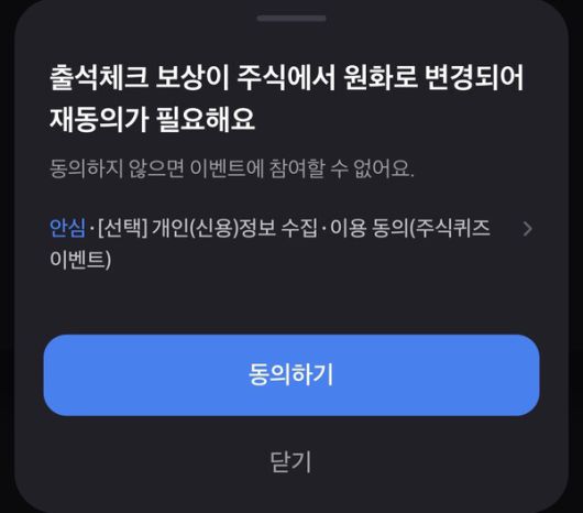 토스증권은 공지를 통해 "출석체크 보상이 주식에서 원화로 변경돼 재동의가 필요하다"며 "동의하지 않으면 이벤트에 참여할 수 없다"고 안내했다.