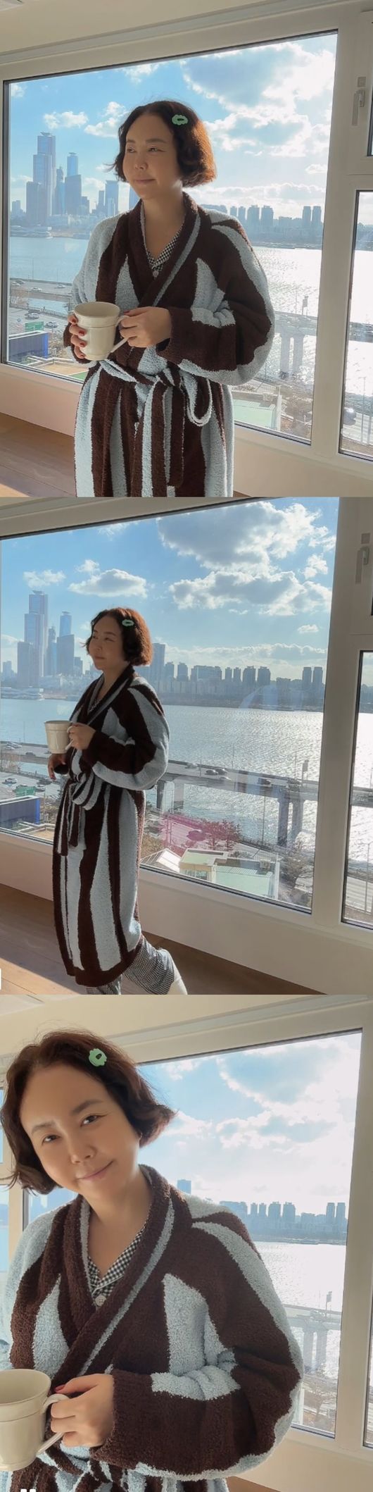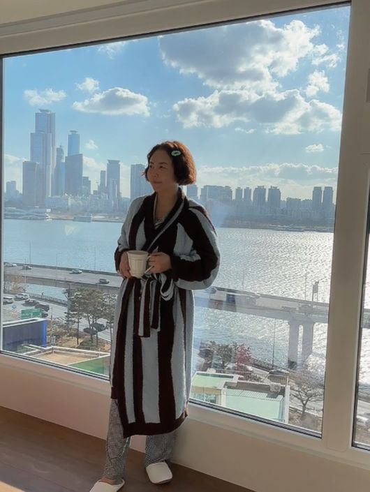 공개된 사진 속 황혜영은 도톰하고 포근해 보이는 로브를 입은 채 거실 창가에 서서 여유로운 시간을 만끽하고 있는 모습.