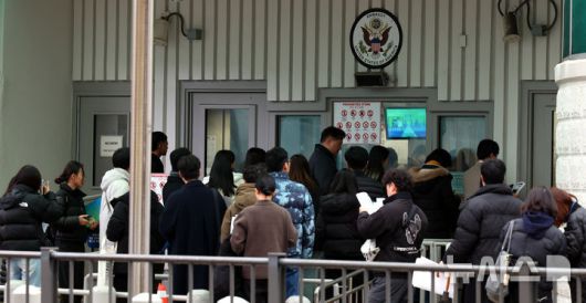 [서울=뉴시스] 박주성 기자 = 사진은 지난 11일 오전 종로구 주한미국대사관 앞에서 시민들이 미국 비자심사를 받기 위해 줄 서 있는 모습. 2025.12.25. park7691@newsis.com |
