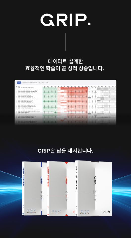 회사 측에 따르면 이번에 출시된 'GRIP'은 출제 확률을 기준으로 필수 개념을 엄선해 개념 이해부터 적용, 정리로 이어지는 체계적인 학습 루프를 교재 구조에 반영해 학교 내신과 수능을 동시에 대비할 수 있도록 구성했다. 특히 감이나 경험에 의존하던 기존 방식에서 벗어나, 모집단에 가까운 표본 데이터를 기반으로 문항을 분석·배치함으로써 실제 시험에서 체감 효용이 높은 문제를 선별해 완성도를 높였다고 회사측은 강조했다.