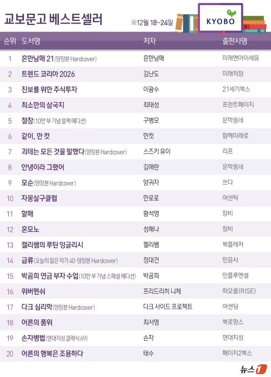 18일 발표한 최신 주간(12월 18~24일) 종합 베스트셀러 집계에 따르면, 흔한남매의 '흔한남매 21'이 정상에 등극했다. 이 시리즈가 출간된 지 10년이 됐지만 인기는 식을 줄을 모르고 있다. 21편 시리즈가 이어지는 동안 주간 종합 1위에 오른 것은 13번째다.