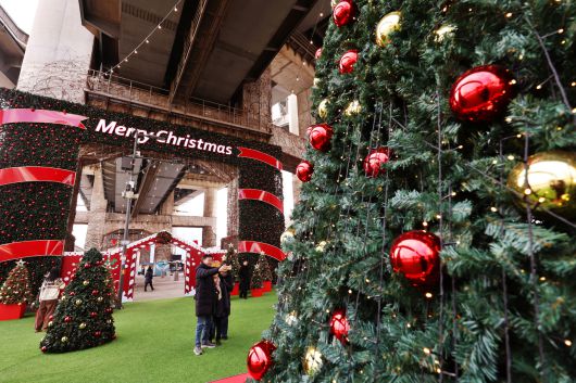 24일 서울 광진구 뚝섬한강공원 자벌레 및 청담대교 하부 일원에서 열린 ‘2025 로맨틱 한강 크리스마스 마켓’을 찾은 시민들이 트리 앞에서 사진을 찍고 있다. [연합] |