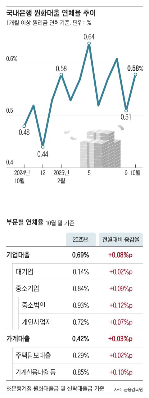 26일 금융감독원에 따르면, 지난 10월 말 기준 국내 은행의 원화 대출 연체율(1개월 이상 원리금 연체 기준)은 0.58%로 9월 말보다 0.07%포인트 올랐다. 다만 이는 8월 말(0.61%)보다는 낮은 수치다. 이 같은 흐름은 통상 은행이 분기 말 연체 채권 관리를 강화하는 것과 무관치 않다. 분기 중에는 연체율이 상승하지만, 은행들이 연체율을 관리하다 보니 분기 말 하락하는 경우가 많다.