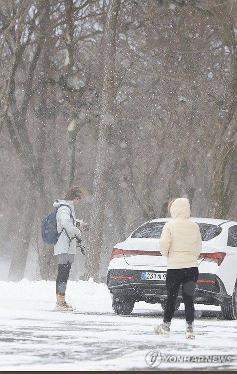 (제주=연합뉴스) 박지호 기자 = 대설특보가 내려진 26일 오전 제주 한라산국립공원 성판악 탐방안내소를 찾은 탐방객들이 전면통제 소식에 아쉬움을 달래고 있다. 2025.12.26