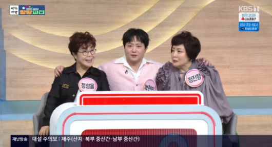 26일 방송된 KBS1 '아침마당'의 '쌍쌍파티'에는 박현빈 가족, 김영희 윤승열 부부, 김학도, 풍금이 출연했다.