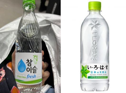 우리나라 인천공항 편의점에서 참이슬을 생수로 착각해 구매한 일본인이 올린 사진(왼쪽)과 유사한 패키지 디자인의 일본 생수 이로하스. 엑스(@curry0124) 캡처 |