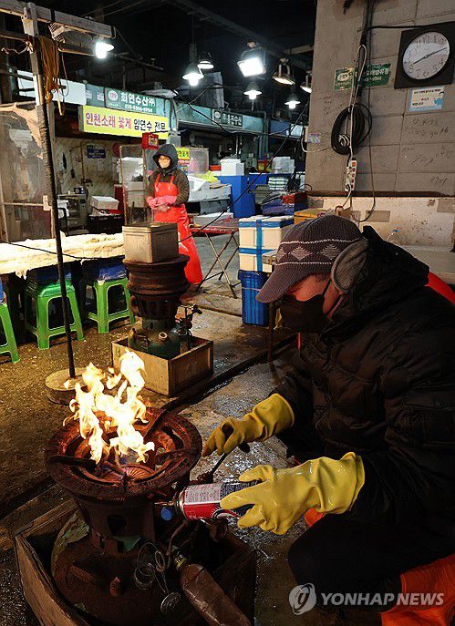 (서울=연합뉴스) 류영석 기자 = 서울의 체감 온도가 영하 20도까지 떨어지는 등 전국 곳곳에 한파 특보가 발효 중인 26일 오전 서울 송파구 가락농수산물종합도매시장의 한 상인이 불을 때고 있다. 2025.12.26
