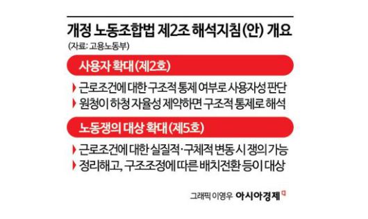 개정 노조법은 하청 노조와 교섭해야 하는 사용자 개념을 확대했다. 근로계약 등을 체결한 당사자가 아니라도 근로자의 근로조건을 실질적·구체적으로 지배·결정할 수 있는 지위에 있는 원청을 사용자로 해석했다. 노동부는 이와 관련해 현장의 혼란과 우려가 커지자 사용자성 판단 기준으로 '근로조건에 대한 구조적 통제'를 제시했다.
