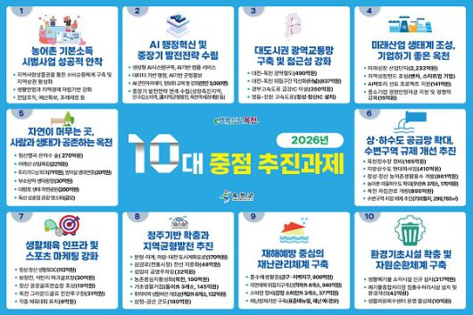 이번에 제시된 10대 중점 추진과제는 △농어촌 기본소득 시범사업의 안정적 안착 △AI 기반 행정혁신 △대도시권 광역교통망 구축 △미래산업 생태계 조성 △자연과 사람이 공존하는 생태도시 조성 △상·하수도 공급망 확충과 수변구역 규제 개선 △생활체육 인프라 확충 △정주기반 강화와 지역균형발전 △재해 예방 중심의 재난관리체계 구축 △환경기초시설 확충과 자원순환체계 구축 등으로 구성되며, 군정 전반에 걸쳐 체계적으로 추진될 계획이다.