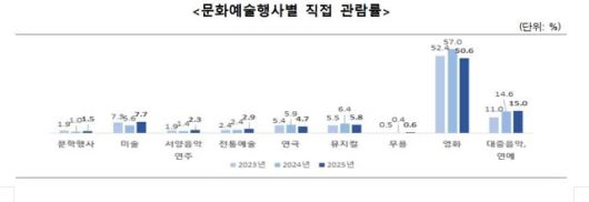 문화누림의 대표적인 지표인 ‘문화예술행사 직접 관람률’은 전년 대비 2.8%포인트 감소한 60.2%를 기록했다. 분야별로 보면 영화(50.6%), 대중음악 및 연예(15%), 미술(7.7%), 뮤지컬(5.8%) 순이었다. 특히 영화 분야는 전 분야 중 가장 높은 관람률을 보이고 있으나 전년 대비 6.4%포인트 감소했고, 대중음악 및 연예는 전년 대비 0.4%포인트, 미술은 전년 대비 2.1%포인트 상승했다.