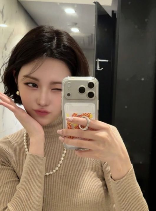 사진 속 리지는 짧은 단발 헤어스타일에 베이지색 니트와 진주 목걸이를 매치한 차분한 겨울 패션으로 눈길을 끌었다.