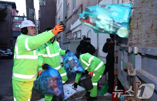 (서울=뉴스1) 신웅수 기자 = 장동혁 국민의힘 대표가 26일 서울 도봉구 일대에서 쓰레기를 정리하고 있다. 2025.12.26/뉴스1