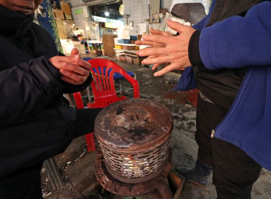 서울의 체감 온도가 영하 20도까지 떨어지는 등 전국 곳곳에 한파 특보가 발효 중인 26일 오전 서울 송파구 가락농수산물종합도매시장에서 상인들이 난로 앞에 손을 녹이고 있다. |