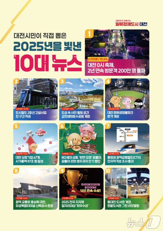 그 외 5위는 '대전 상장기업 67개, 시가총액 87조 원 달성', 6위는 '꿈돌이 라면, 꿈돌이 호두과자 연이은 인기 행진'이 차지했다. 7위는 '충청권 광역급행철도(CTX) 민자적격성 조사통과', 8위는 '유성복합터미널 신축공사 준공', 9위는 '4년 연속 수상, 2025 전국 지자체 일자리대상 최우수상', 10위는 '동대전도서관 개관, 한밭도서관 그린리모델링'으로 집계됐다.