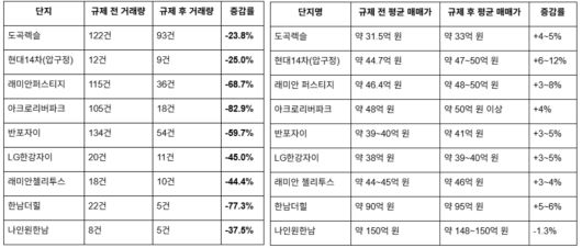 26일 부동산 실거래 데이터 플랫폼 집품에 따르면 강남·서초·용산에 위치한 대표적인 초고가 아파트 9곳의 매매 거래량은 규제 이전 556건에서 규제 이후 241건으로 56.7% 감소했다. 이번 분석 대상은 도곡렉슬, 압구정 현대14차, 래미안 퍼스티지, 아크로리버파크, 반포자이, LG한강자이, 래미안 첼리투스, 한남더힐, 나인원한남 등이다.