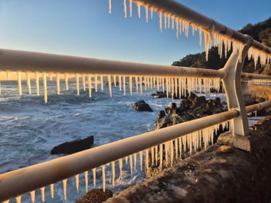 강원 대부분 지역에 한파특보가 발효된 26일 동해안 대표 해안도로인 강릉시 강동면 심곡~금진 구간 헌화로 난간에 고드름이 줄지어 매달려 있다. 뉴스1 |
