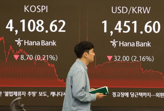 24일 오후 서울 중구 하나은행 딜링룸에 시황 전광판이 보이고 있다. (사진=뉴시스) |