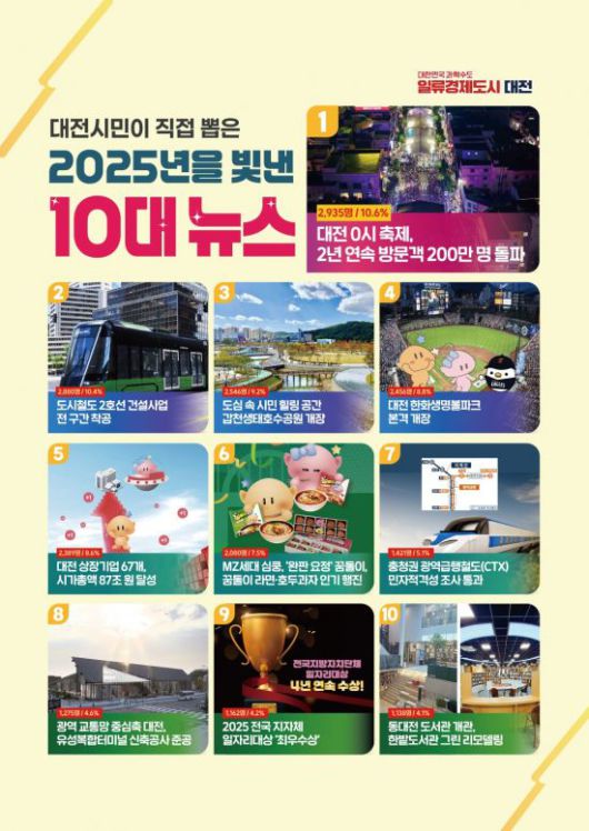 대전시가 연말을 맞아 시민과 함께 다양한 시정 성과를 공유하고 이에 대한 시민 의견을 듣기 위해 '2025년을 빛낸 대전시정 10대 뉴스' 투표를 진행했다.