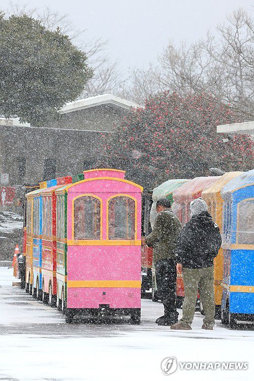 (제주=연합뉴스) 박지호 기자 = 대설특보가 내려진 26일 오전 제주시 구좌읍 송당리 동화마을에서 관계자들이 투어 기차 운행을 준비하고 있다. 2025.12.26