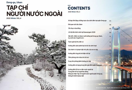 [헤럴드경제(울산)=박동순 기자] 울산 동구청이 외국인 주민들의 생활 적응 지원을 위해 제작하고 있는 <울산 동구 외국인 소식지> 2025년 겨울호가 나왔다. 베트남어, 스리랑카어, 중국어, 우즈베키스탄어 등 4개 국어 20쪽 분량이다.