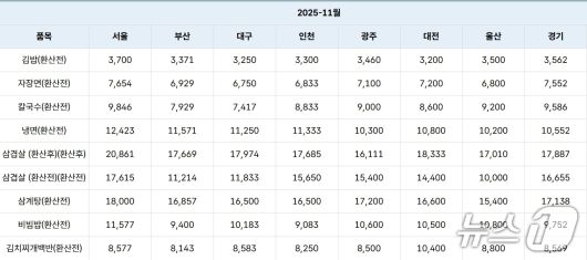 26일 한국소비자원 가격정보서비스 '참가격'에 따르면 11월 대구에서 소비자 선호 외식 메뉴 8개인 김밥, 짜장면, 칼국수, 냉면, 삼겹살, 삼계탕, 비빔밥, 김치찌개 백반의 평균 가격이 전년 동월 대비 5.48% 상승했다.