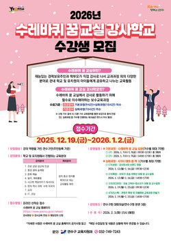교육은 2026년 1월 7일부터 1월 23일까지 연수구청 대회의실서 진행되며, 총 420명을 과정별로 선착순 모집한다. 신청은 2025년 12월 19일부터 2026년 1월 2일까지 수레바퀴 꿈 교실 홈페이지를 통해 무료로 가능하다.