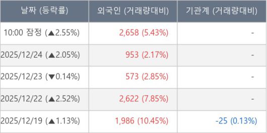 [서울=뉴스핌] 로보뉴스 = 26일 10시 15분 현재 KB오토시스(024120)는 전일 대비 2.55% (현재가 3,820원) 상승했고, 외국인이 최근 7일 연속 순매수(누적 10,339주, 잠정) 행진을 하고 있다.