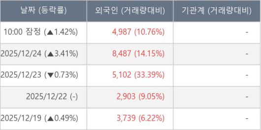 [서울=뉴스핌] 로보뉴스 = 26일 10시 15분 현재 신진에스엠(138070)은 전일 대비 1.42% (현재가 2,150원) 상승했고, 외국인이 최근 5일 연속 순매수(누적 25,218주, 잠정) 행진을 하고 있다.
