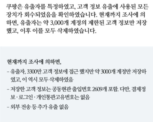 쿠팡은 지난 25일 보도자료를 통해 고객 개인정보를 유출한 전직 직원을 특정했으며, 해당 인물이 정보 탈취에 사용한 노트북과 저장장치 등 모든 장비를 회수했다고 밝혔다. 포렌식 분석 결과를 근거로 "유출자는 3300만 명의 고객 계정에 접근할 수 있었지만, 실제로 저장한 정보는 약 3000개 계정에 국한됐다"며 "해당 정보는 외부로 전송되지 않았고 현재 모두 삭제됐다"고 주장했다.