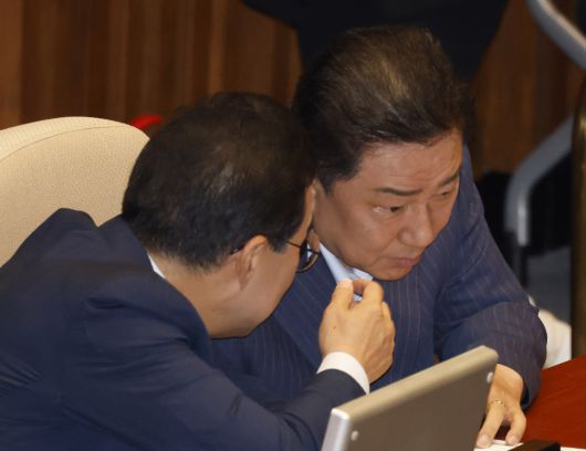 김병기(오른쪽) 더불어민주당 대표가 서울 여의도 국회에서 열린 본회의에서 동료 의원들과 대화하고 있다. 고이란 기자 photoeran@ |