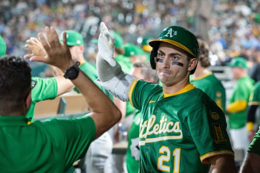 애슬레틱스 소더스톰이 11일(한국시간) 미국 캘리포니아주 웨스트 새크라멘토 서터 헬스 파크에서 열린 2025 메이저리그(ML) 토론토전에서 6회말 홈런을 터뜨린 뒤 동료들과 세리머니를 하고 있다. 사진 | Imagn Images 연합뉴스 |