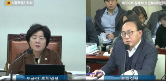 제333회 정례회 보건복지위원회 회의에서 복지실장을 상대로 질의하는 오금란 의원 |