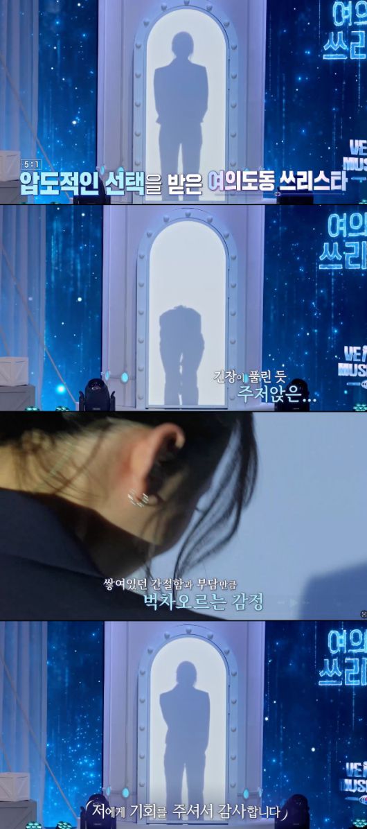 무대에 대한 간절함은 베일 뒤에서 감격의 눈물로 이어졌다. 볼빨간사춘기 안지영 팀에서 진한 감성 무대를 보여준 ‘여의도동 쓰리스타’는 파이널 진출 결과가 나오자 그 자리에서 주저앉았다. 벅찬 감정에 울먹이는 음성으로 “마지막일 것이라 생각하며 노래를 불렀는데 기회를 주셔서 감사하다. 무대가 정말 간절하다”고 말해 깊은 인상을 남겼다.