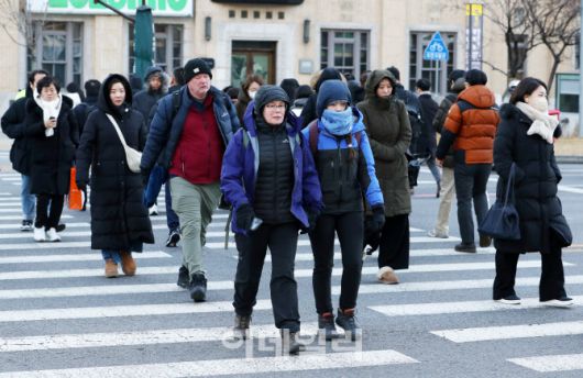 [이데일리 김태형 기자] 올겨울 가장 추운날씨를 보인 26일 서울 광화문네거리에서 관광객들과 시민들이 이동을 하고 있다. 전국적으로 어제보다 기온이 10도에서 15도가량 떨어져 대부분 지역에 한파특보가 발령됐다. 서울은 영하 11도까지 떨어졌고 체감온도는 영하 17도를 나타냈다.