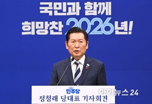 [아이뉴스24 곽영래 기자]더불어민주당 정청래 대표가 26일 서울 여의도 국회에서 열린 기자회견에서 발언하고 있다.