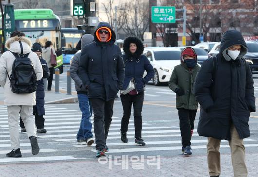 [이데일리 김태형 기자] 올겨울 가장 추운날씨를 보인 26일 서울 광화문네거리에서 관광객과 시민들이 이동을 하고 있다. 전국적으로 어제보다 기온이 10도에서 15도가량 떨어져 대부분 지역에 한파특보가 발령됐다. 서울은 영하 11도까지 떨어졌고 체감온도는 영하 17도를 나타냈다.