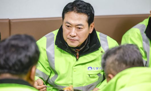 장동혁 국민의힘 대표가 26일 서울 도봉구 도봉산길 인근에서 열린 국민의힘 약자와의동행위원회 봉사활동을 마친 뒤 도봉구자원순환센터 관계자들과 간담회를 갖고 있다. 뉴시스 |