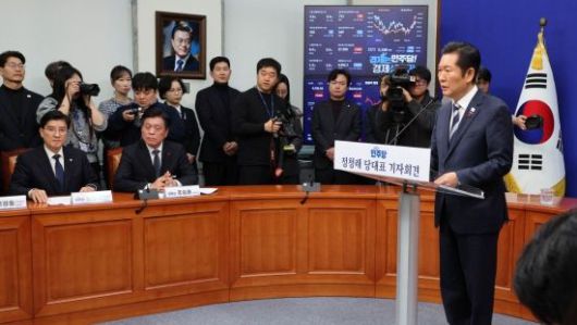 정청래 더불어민주당 대표가 26일 국회에서 기자회견을 하고 있다.