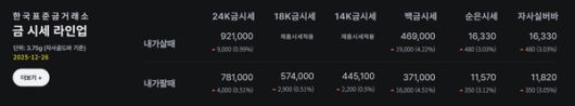 [스타데일리뉴스=서태양기자] 한국표준금거래소 12월 26일 기준 24K 금시세는 투자 심리 위축과 연말 유동성 확보 움직임에 따라 하락세를 보인 바와는 달리 상승세를 기록했다. 3.75g 기준 24K 금을 살 때는 921,000원으로, 전일 대비 9,000원(0.99%) 상승했다. 판매 가격 또한 781,000원으로 4,000원(0.51%) 상승했다.