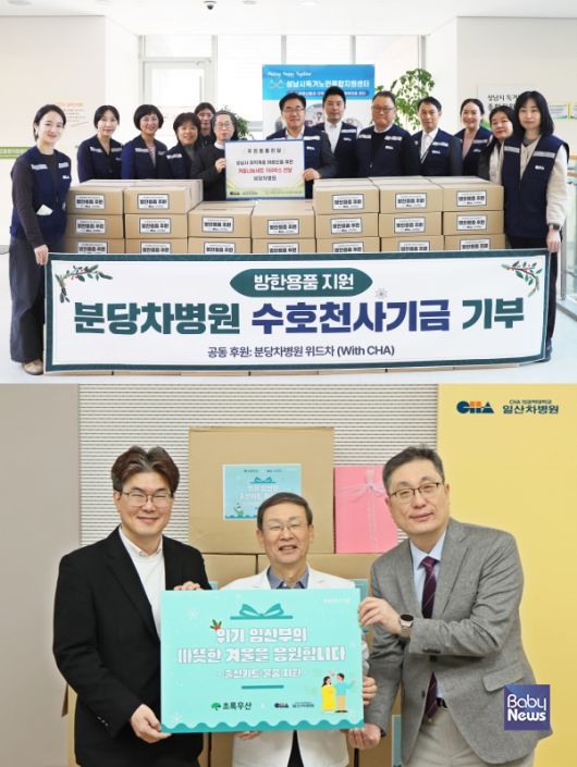 차 의과학대학교 차병원이 연말을 맞아 의료비 지원 및 사회공헌 기금인 '수호천사기금’을 통해 지역사회 기부 활동을 전개했다. 분당차병원(원장 윤상욱)과 일산차병원(원장 송재만)은 각각 지역 취약계층 어르신과 위기 임산부에게 물품을 기부했다.