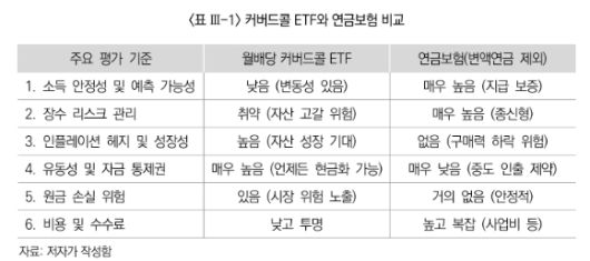 조 연구위원은 "기존 연금 상품 이외에 월 배당 ETF가 가지는 장점을 적용하고, 보험회사 연금 고유의 장점은 유지하는 전략이 필요하다"며 "실적배당을 선호하는 소비자를 위한 연금저축보험, 실적배당 상품에 투자하면서도 안정적인 연금 수령을 하는 보증형 실적배당 보험, 변액연금 보험 등을 검토할 수 있다"고 말했다.