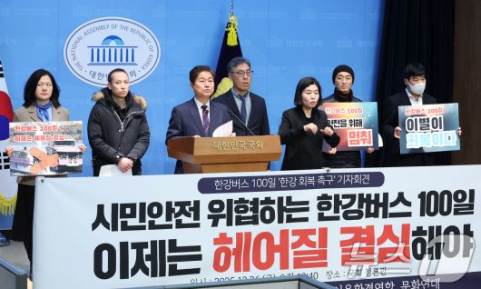 (서울=뉴스1) 신웅수 기자 = 서울시장 출마를 선언한 김영배 더불어민주당 의원이 26일 서울 여의도 국회 소통관에서 서울시 한강버스 100일 관련 기자회견을 하고 있다. 2025.12.26/뉴스1